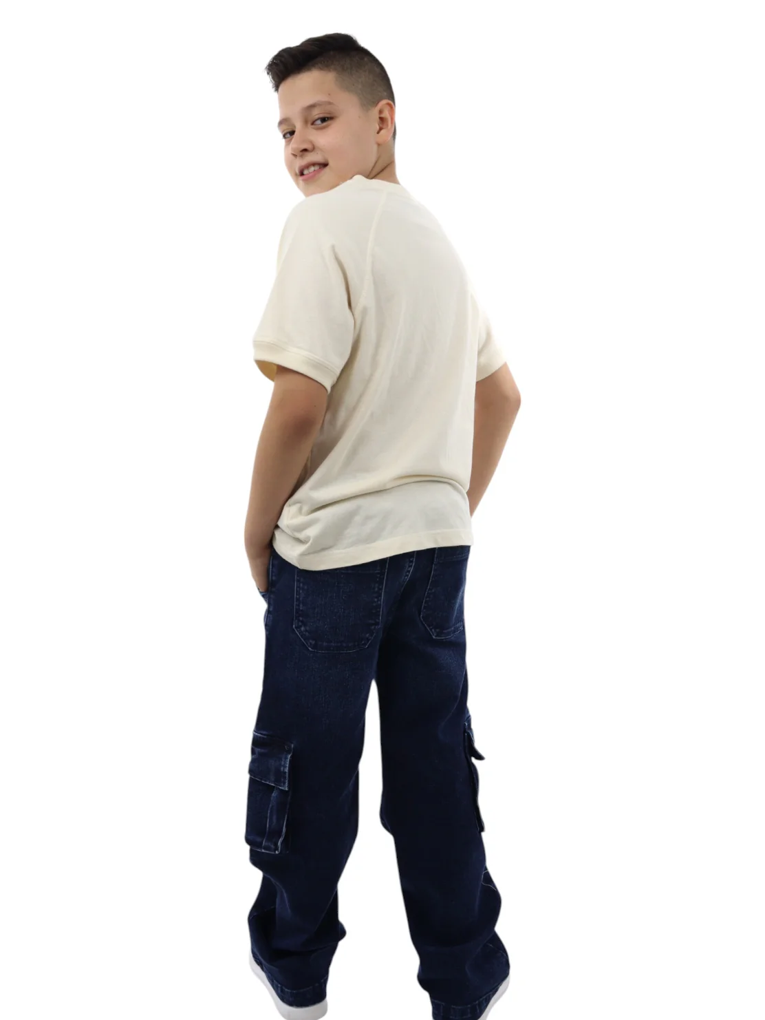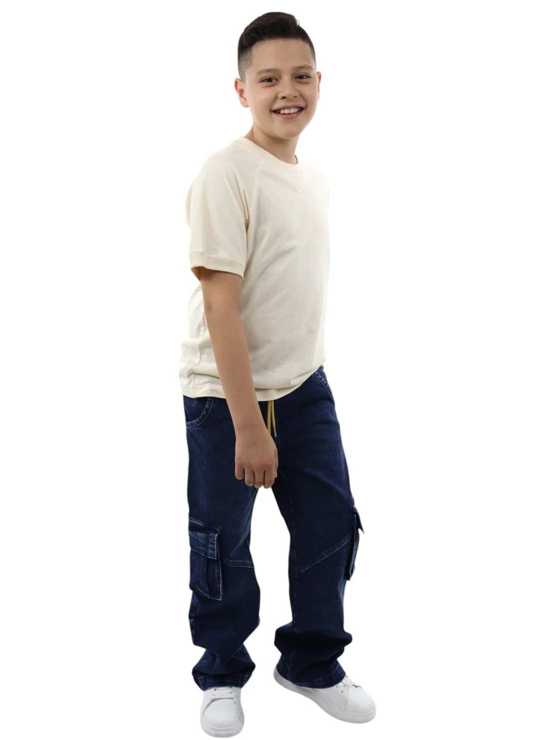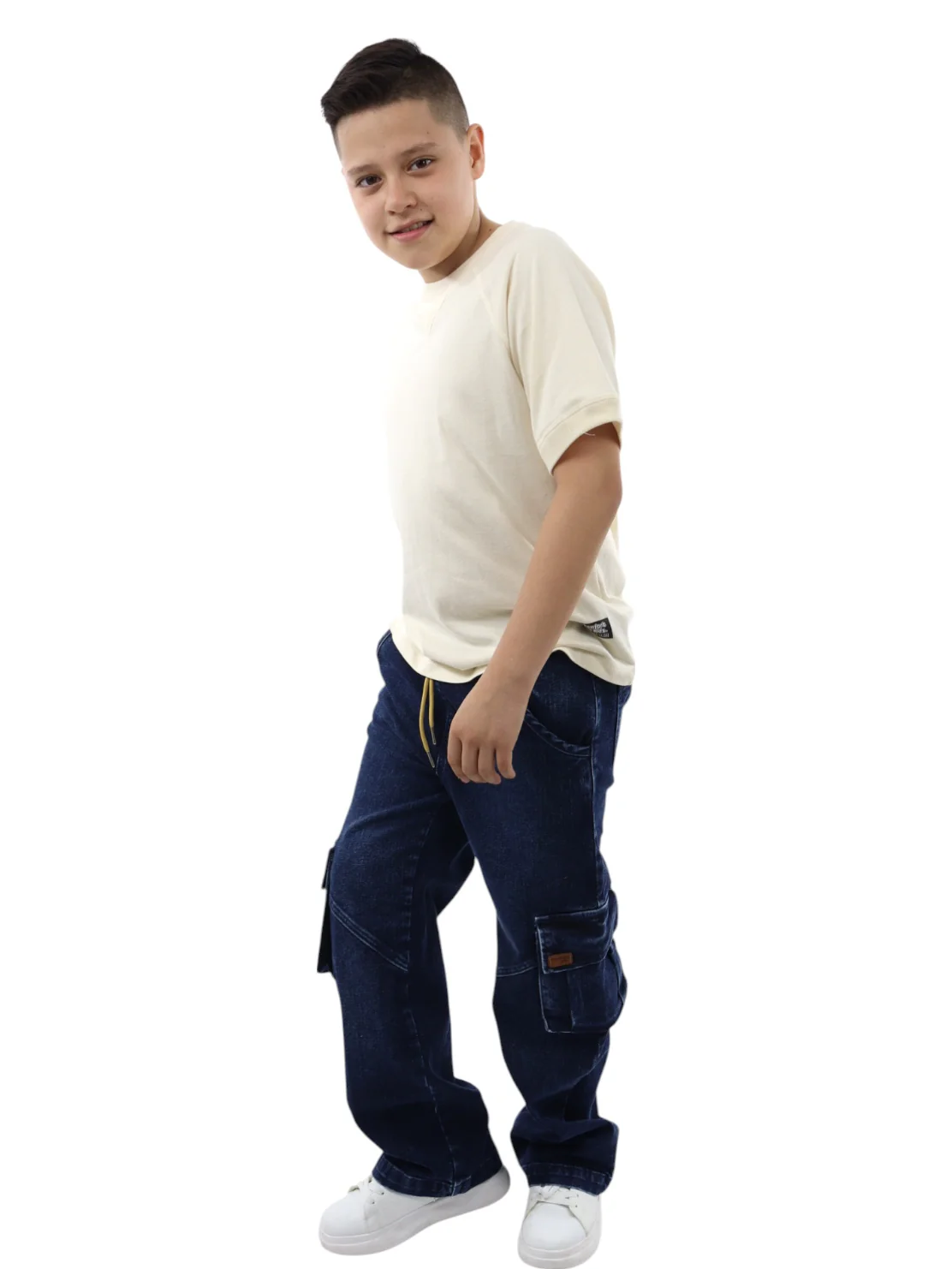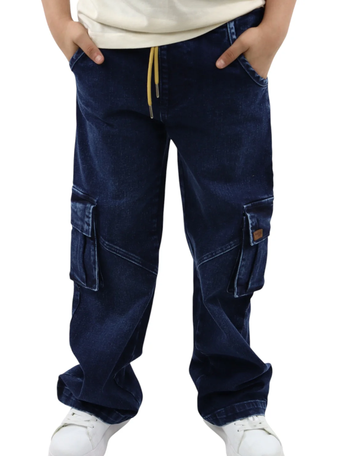 Jogger baggy de mezclilla, con cinturilla elástica y cordón para ajustar. Bolsas cargo con tapeta. Lavado azul oscuro