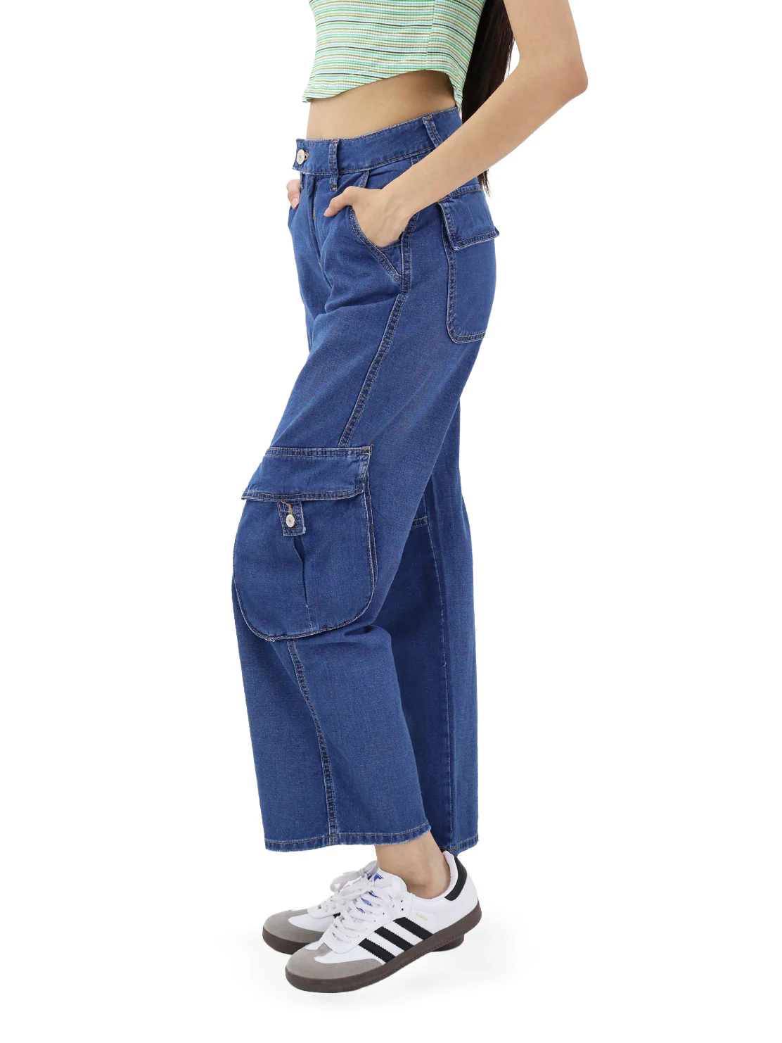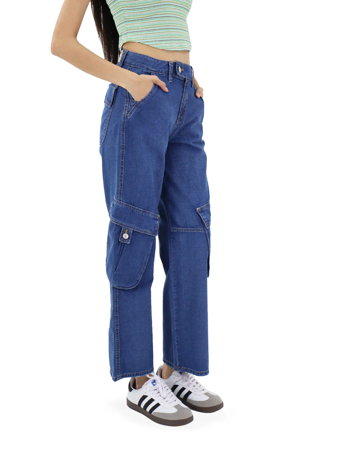 Cargo amplio de talle alto, con bolsillos en la parte delantera y trasera, cierre de botón y cremallera, pierna amplia. Lavado azul oscuro.