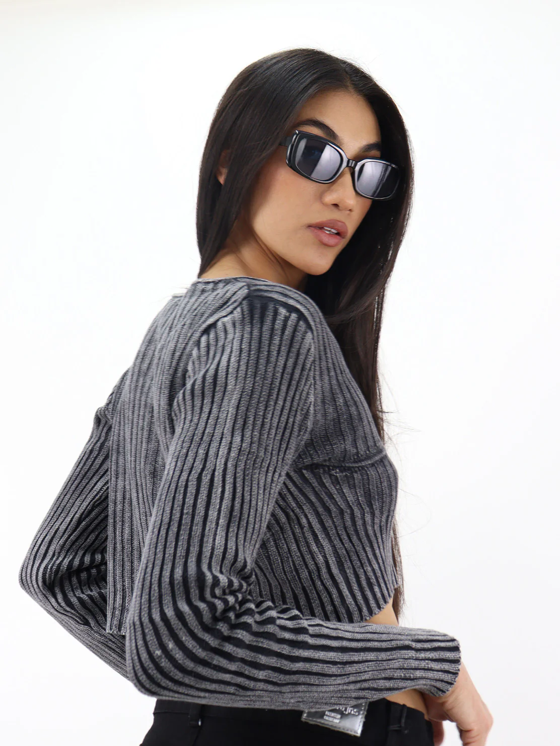 Suéter corto gris oxford, manga larga, cuello redondo, suave, casual
