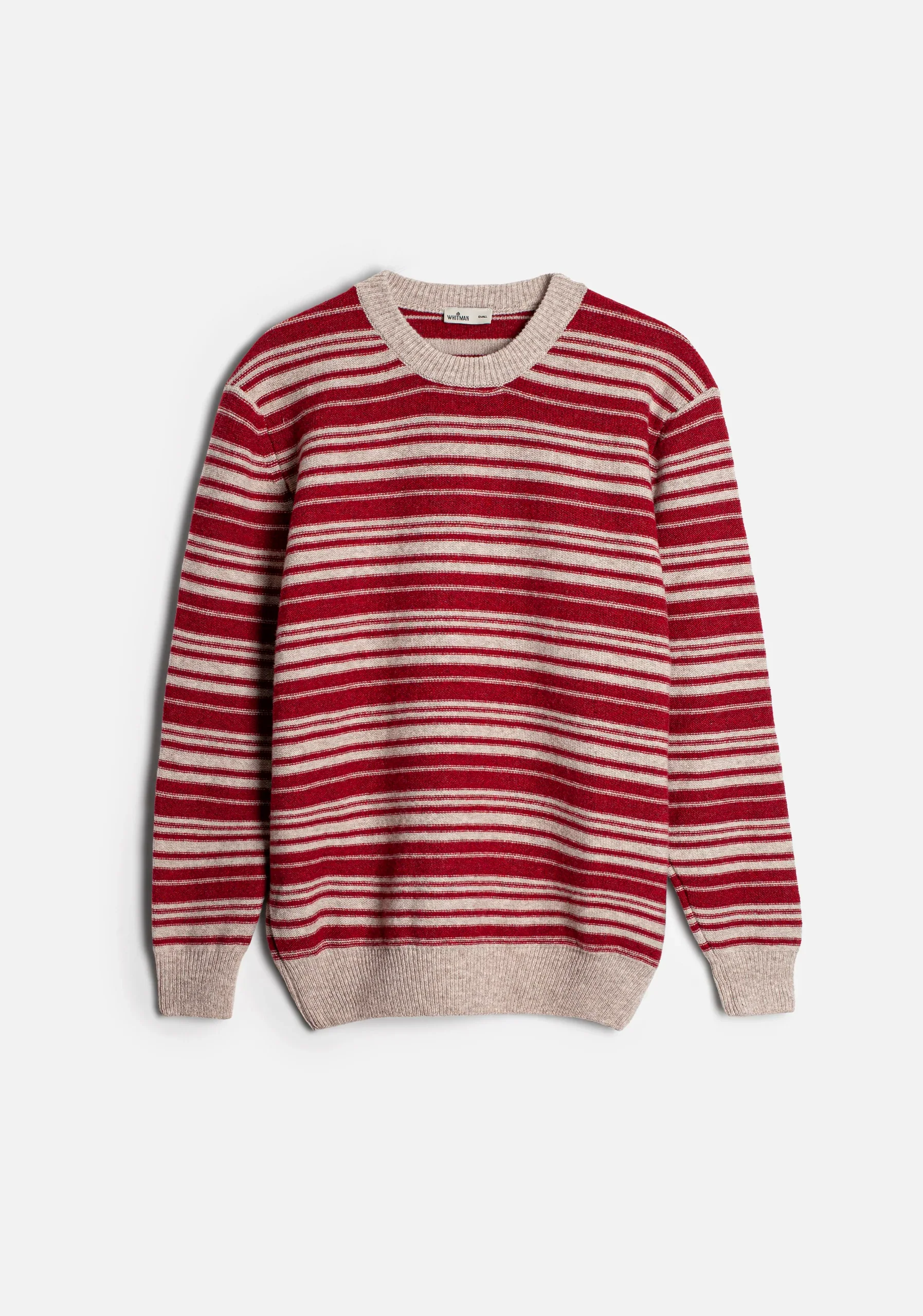 Este sweater tejido, elaborado en lana merino italiana de la más alta calidad, destaca por su diseño moderno y sofisticado. Con cuello redondo y detalles en rib en los puños, pretina y cuello en color contraste, combina elegancia y carácter. El cuerpo presenta un tejido de rayas horizontales en dos tonos, aportando un efecto visual dinámico y contemporáneo. Una prenda versátil y refinada, perfecta para quienes buscan un equilibrio entre estilo y confort en su día a día.