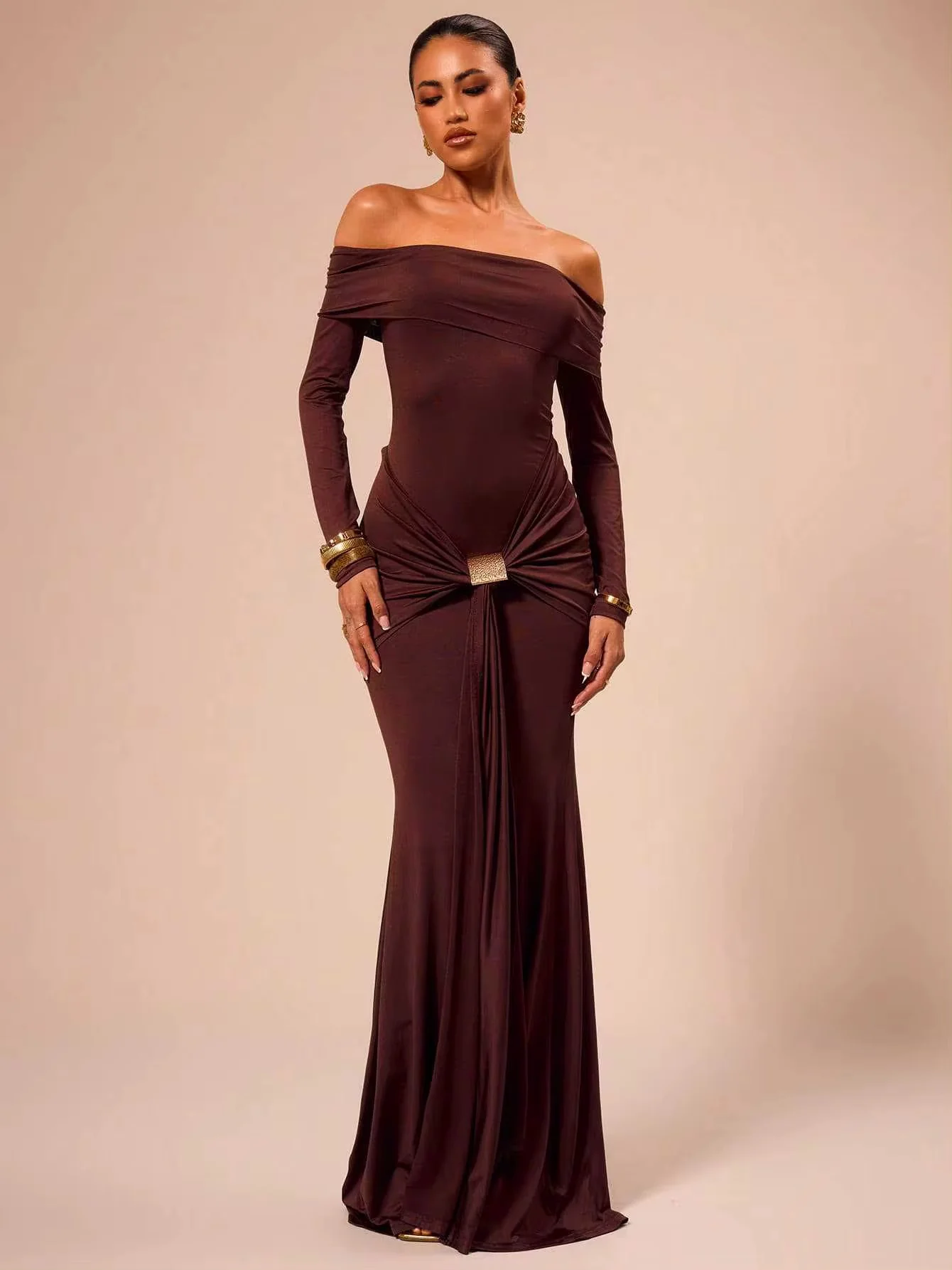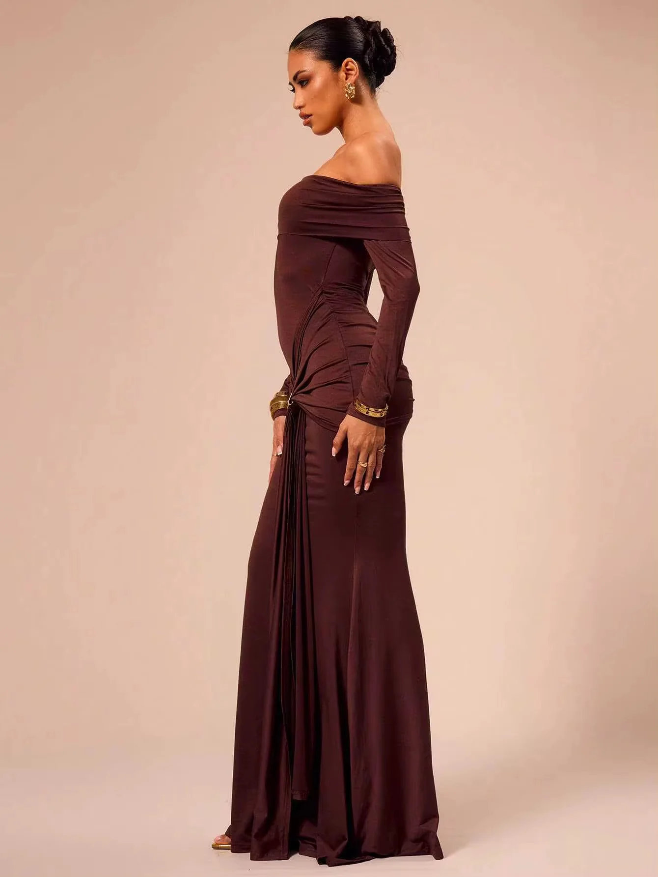 El Vestido Noela abraza la silueta con sutileza gracias a su diseño off shoulder que resalta los hombros y a su caída fluida que alarga la figura.